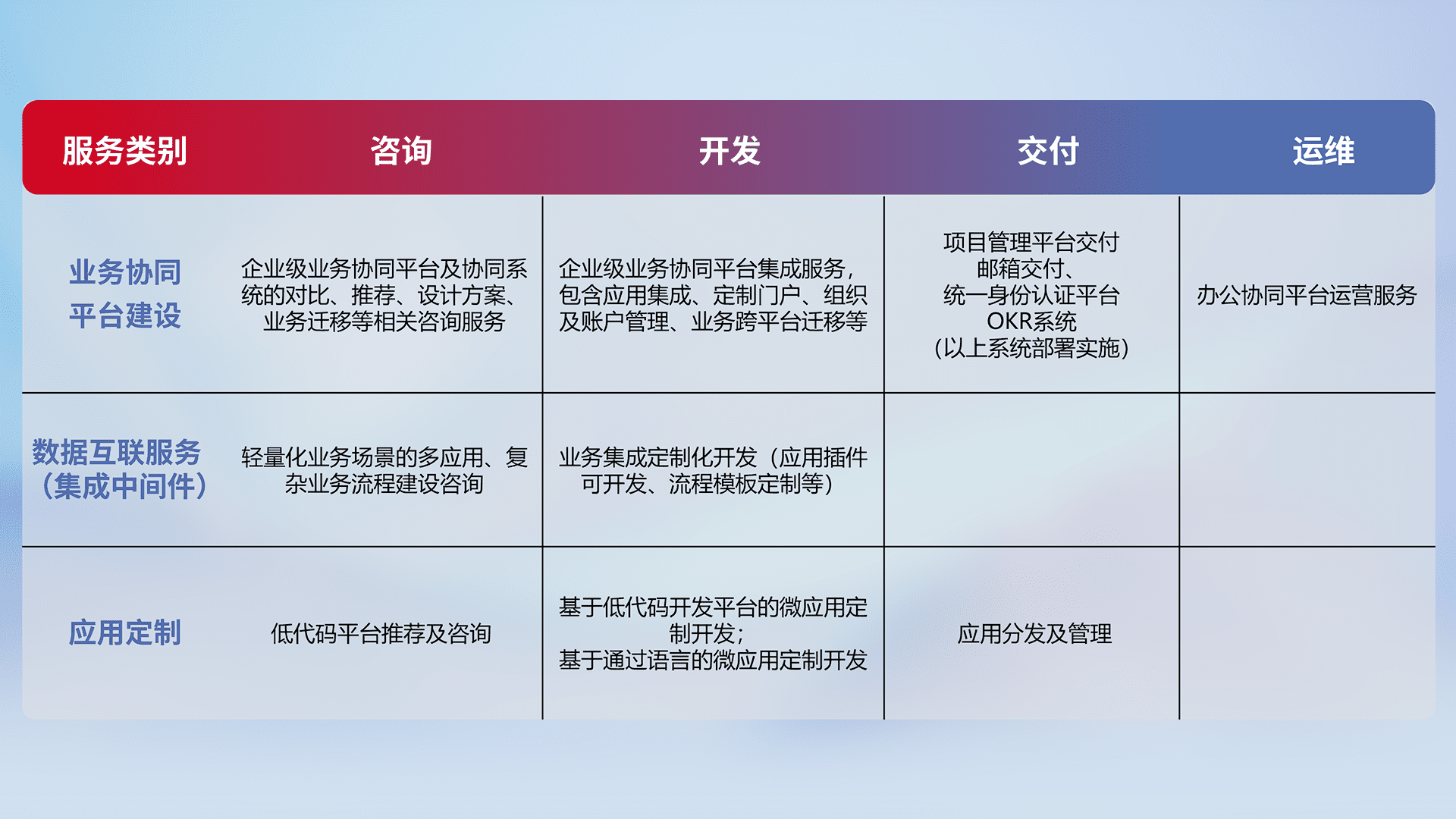 针对钉钉、、企微、、、、IDaas等平台级产品提供产品的规划、、方案、、交付、、定制化开发等服务,,,,实现如统一协同办公、、、智能客户服务、、、混合会议管理、、智能数据查询、、等业务场景,,实现数字化转型。。